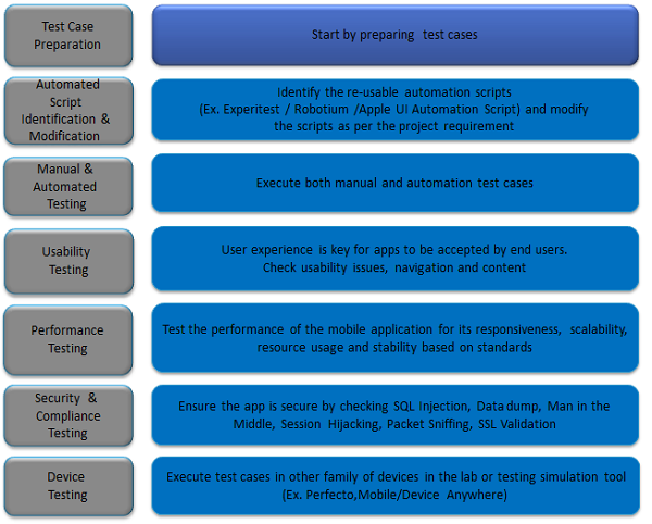 Test Case Preparation − The mobile testing starts with the creation of test cases. The requirements are identified and the corresponding test cases are written and reviewed. These test cases are then stored in a test management tool.