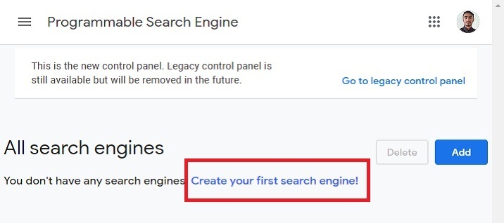 Step 1 ? Create an account on the Custom Search engine. When you create an account successfully, you will see the below interface. You can click the ?Create your first search engine!' text.