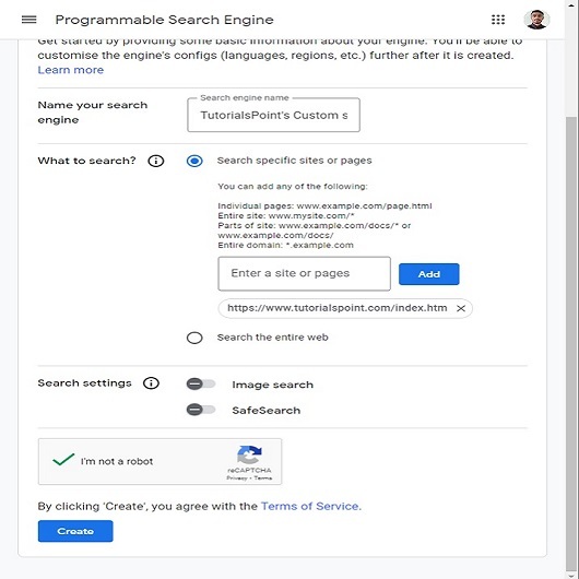 Step 2 ? Now, fill in the required details and add the website link on which you want to use the Google custom search engine. You can select the ?Search the entire web' radio component if you want to use it on any website. Next, click on the create button.