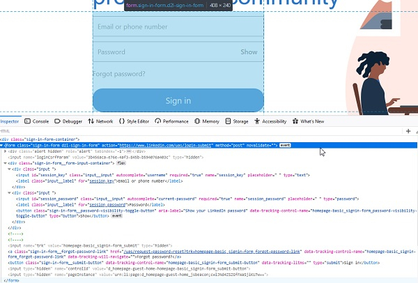 In the above example, we shall try to submit the form with the help of the Email or Password field and not by clicking on the Sign in button.