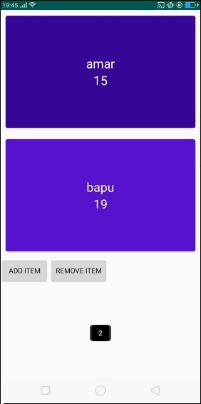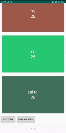 <?xml version = "1.0" encoding = "utf-8"?> <android.support.v7.widget.CardView xmlns:android = "http://schemas.android.com/apk/res/android" xmlns:card_view = "http://schemas.android.com/apk/res-auto" android:layout_width = "match_parent" card_view:cardCornerRadius = "4dp" android:id = "@+id/card_view" android:layout_margin = "10dp" android:layout_height = "200dp"> <LinearLayout android:id = "@+id/parent" android:layout_gravity = "center" android:layout_width = "match_parent" android:orientation = "vertical" android:gravity = "center" android:layout_height = "match_parent"> <TextView android:id = "@+id/name" android:layout_width = "wrap_content" android:gravity = "center" android:textSize = "25sp" android:textColor = "#FFF" android:layout_height = "wrap_content" /> <TextView android:id = "@+id/age" android:layout_width = "wrap_content" android:gravity = "center" android:textSize = "25sp" android:textColor = "#FFF" android:layout_height = "wrap_content" /> </LinearLayout> </android.support.v7.widget.CardView>