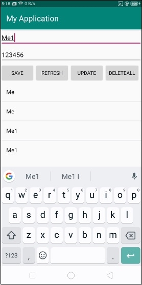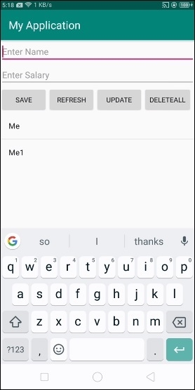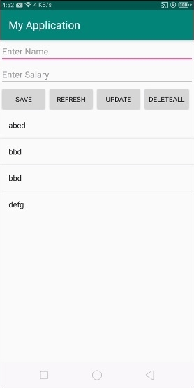 <?xml version="1.0" encoding="utf-8"?> <LinearLayout xmlns:android="http://schemas.android.com/apk/res/android" xmlns:tools="http://schemas.android.com/tools" android:layout_width="match_parent" android:layout_height="match_parent" tools:context=".MainActivity" android:orientation="vertical"> <EditText android:id="@+id/name" android:layout_width="match_parent" android:hint="Enter Name" android:layout_height="wrap_content" /> <EditText android:id="@+id/salary" android:layout_width="match_parent" android:inputType="numberDecimal" android:hint="Enter Salary" android:layout_height="wrap_content" /> <LinearLayout android:layout_width="wrap_content" android:layout_height="wrap_content"> <Button android:id="@+id/save" android:text="Save" android:layout_width="wrap_content" android:layout_height="wrap_content" /> <Button android:id="@+id/refresh" android:text="Refresh" android:layout_width="wrap_content" android:layout_height="wrap_content" /> <Button android:id="@+id/udate" android:text="Update" android:layout_width="wrap_content" android:layout_height="wrap_content" /> </LinearLayout> <ListView android:id="@+id/listView" android:layout_width="match_parent" android:layout_height="wrap_content"> </ListView> </LinearLayout>