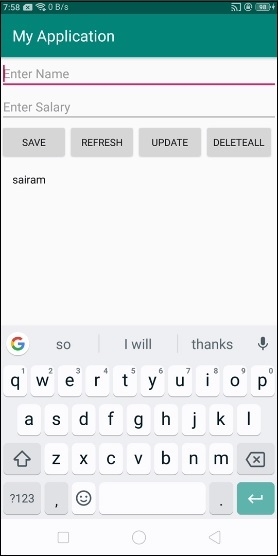 <?xml version="1.0" encoding="utf-8"?> <LinearLayout xmlns:android="http://schemas.android.com/apk/res/android" xmlns:tools="http://schemas.android.com/tools" android:layout_width="match_parent" android:layout_height="match_parent" tools:context=".MainActivity" android:orientation="vertical"> <EditText android:id="@+id/name" android:layout_width="match_parent" android:hint="Enter Name" android:layout_height="wrap_content" /> <EditText android:id="@+id/salary" android:layout_width="match_parent" android:inputType="numberDecimal" android:hint="Enter Salary" android:layout_height="wrap_content" /> <LinearLayout android:layout_width="wrap_content" android:layout_height="wrap_content"><Button android:id="@+id/save" android:text="Save" android:layout_width="wrap_content" android:layout_height="wrap_content" /> <Button android:id="@+id/refresh" android:text="Refresh" android:layout_width="wrap_content" android:layout_height="wrap_content" /> <Button android:id="@+id/udate" android:text="Update" android:layout_width="wrap_content" android:layout_height="wrap_content" /> </LinearLayout> <ListView android:id="@+id/listView" android:layout_width="match_parent" android:layout_height="wrap_content"> </ListView> </LinearLayout>