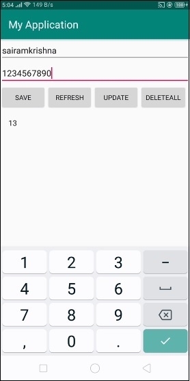 In the above code, we have taken name and salary as Edit text, when user click on save button it will store the data into sqlite data base. Click on refresh button to get the listview.