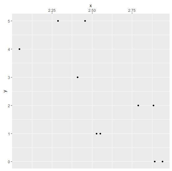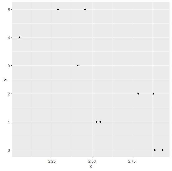 x y 1 2.287578 5 2 2.788305 2 3 2.408977 3 4 2.883017 2 5 2.940467 0 6 2.045556 4 7 2.528105 1 8 2.892419 0 9 2.551435 1 10 2.456615 5 library(ggplot2)