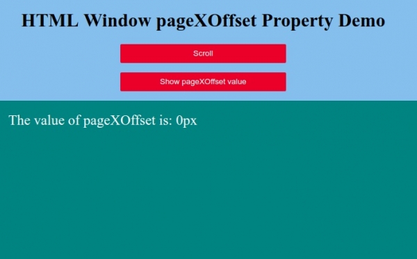 Click on “Show pageXOffset value” button to display the value of pageXOffset property: