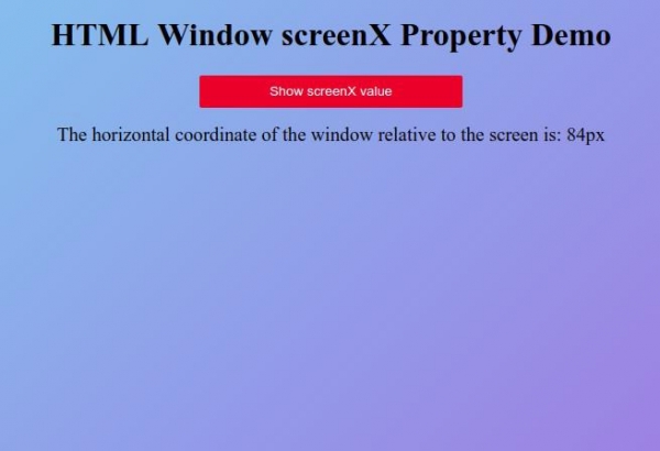 The HTML Window screenX property returns the horizontal coordinates of the window relative to the screen. It is supported by all browsers.