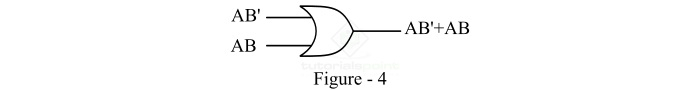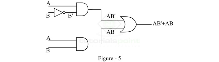 Now, the term AB' is the output of a two input AND gate whose inputs are A and B'. Where, B' is in turn output of a NOT gate whose input is B. The term AB is the output of a two input AND gate whose inputs are A and B. Hence, the logic circuit will become as shown in Figure-5.