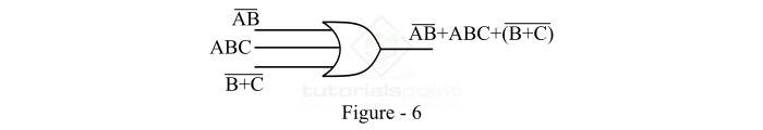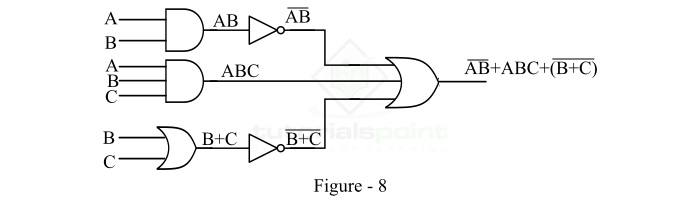 Here, the term $\mathrm{(\overline{AB})}$ must be the output of a NOT gate whose input is AB. The second term ABC must be the output of a three-input AND gate whose inputs are A, B, and C, and the third term $\mathrm{(\overline{B+C})}$ must be the output of a NOT gate whose input is B + C. Thus, we introduce two NOT gates and one AND gate in the logic circuit as shown in Figure-7.