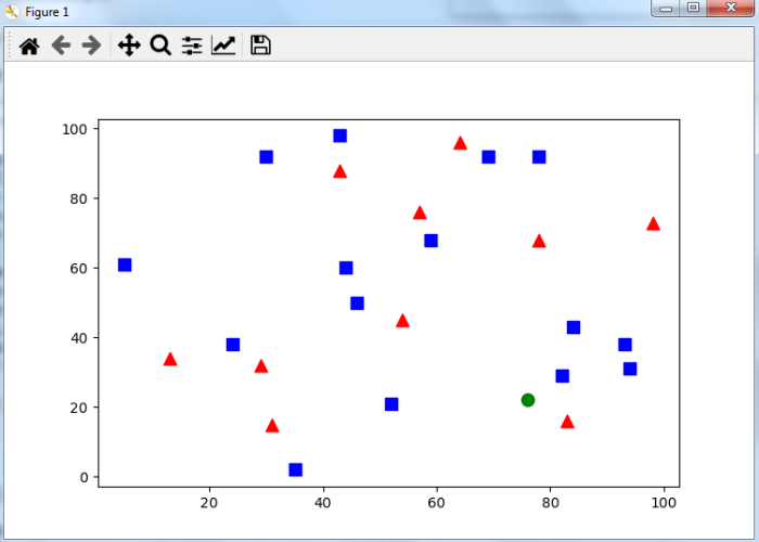 The result shows that the new number belongs to the Blue family as two of the three nearest neighbor belong to the blue family. It will also display the following output window ?