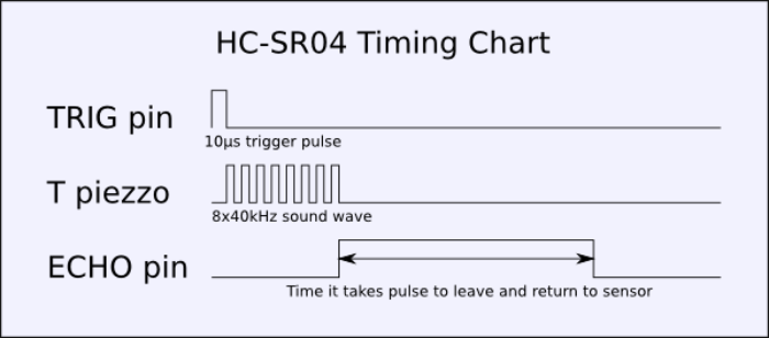 The HC-SR04 emits ultrasonic waves at 40,000 Hz. In order to make it emit waves, we need to give a 10 microseconds HIGH pulse at the Trigger pin. The module responds by emitting a sonic burst of 8 pulses. This 8-pulse pattern helps differentiate the pulses emitted by the module from the ambient noise. As soon as the pulses are transmitted, the ECHO pin goes HIGH, and stays HIGH till all the reflected pulses are received. The module times out after 38ms, if all the reflected pulses are not received in this duration.
