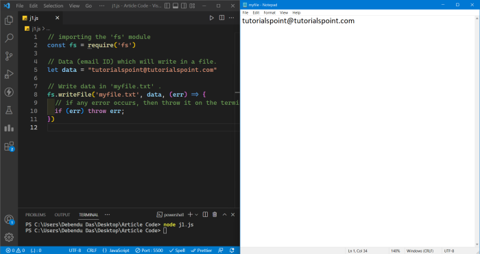 In this example, we have used the writeFile method of the file system library to write something to a file using JavaScript. The code file needs to be saved as a ?.js' extension. To execute this file, we need to write ?node <file_name>.js' on the system's terminal. We will write an email id on a text file using the fs module. After executing the code, the users can open the text file and verify it on their system.