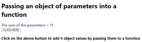 <h3>Click on the above button to add 4 object values by passing them to a function</h3>