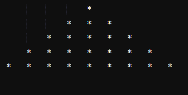 We will initialize the row to 5 and a loop runs from i-1 to i<=rows for the number of rows and another loop(for loop) which is outer one runs from j=1 to j<=1 which helps in printing the star. The process repeats until the pyramid is printed with increasing stars in each row.