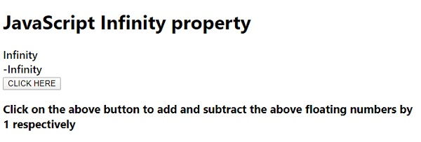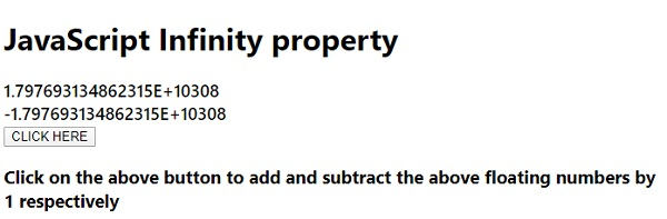 The JavaScript infinity property displays infinity if the upper limit of the floating-point number is exceed and − infinity if the lower limit of the floating point number has has been exceeded.