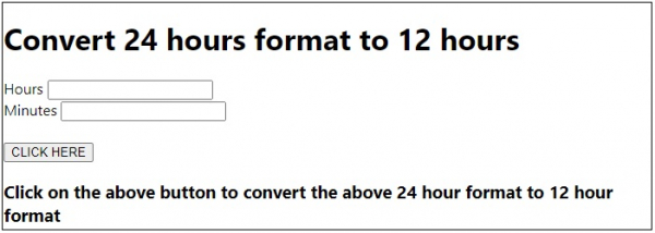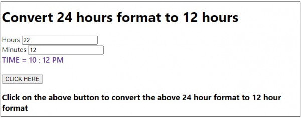 To convert 24 hours format to 12 hours in Javascript, we have used basic if/else condition where we check if the hour is greater than 12.