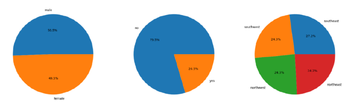 After importing the required libraries, the dataset is stored into a python dataframe. The code then checks for null values in the dataset and pie charts and bar graphs are plotted accordingly to visualize the distribution and proportions of sex, region and smoker columns in the dataset.