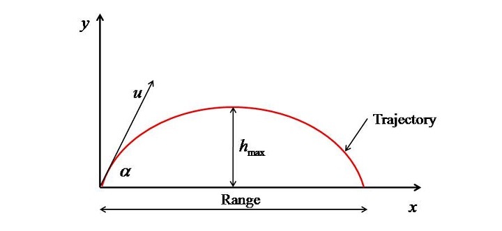 Here, "u" is the velocity with which the projectile is being projected. ? is the angle of projection of the projectile. The path taken up by the projectile during its flight. Range is the maximum horizontal distance travelled by the projectile. $\mathrm{h_{max}}$ is the maximum height attained by the projectile. Moreover, the time taken up by the projectile to travel the range is called as time of flight.