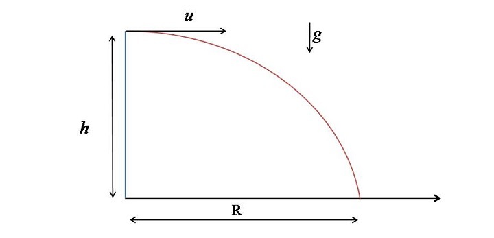 In the first case, the projectile is fired from an elevated place with only horizontal velocity (?) and will strike the ground after some distance R as shown in figure given below.