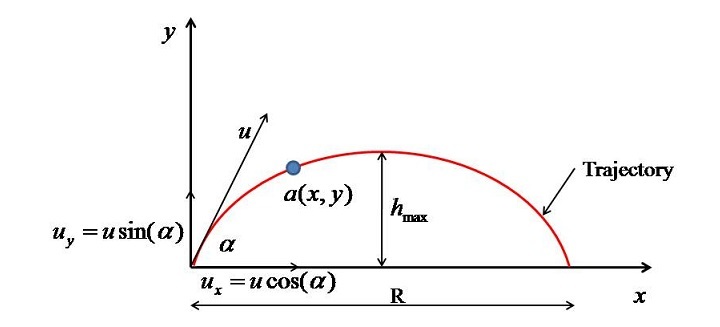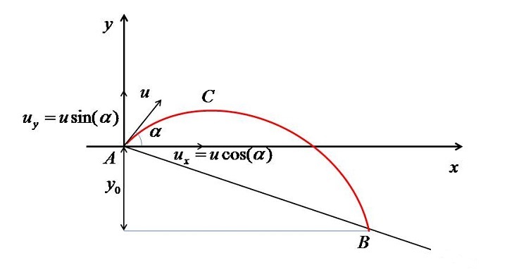 $$\mathrm{y=x\tan(\alpha)-\frac{1}{2}\frac{gx^{2}}{u^{2}\cos^{2}\left ( \alpha \right )}}$$