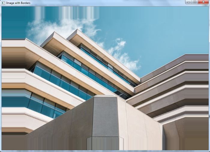 # import required library import cv2 # read input image img = cv2.imread('building.jpg') src = img dst = None top, bottom, left, right = 50, 50, 100, 100 borderType = cv2.BORDER_REPLICATE # add borders img1 = cv2.copyMakeBorder(src, top, bottom, left, right, borderType,dst) cv2.imshow("Image with Borders", img1) cv2.waitKey(0) cv2.destroyAllWindows()