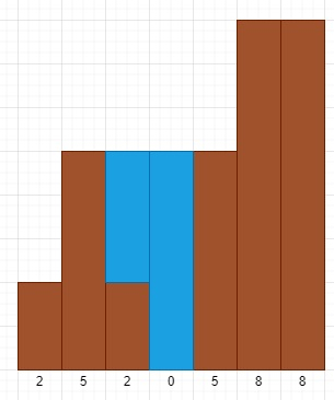 class Solution(object): def trap(self, height): stack = [] water = 0 i=0 while i<len(height): if len(stack) == 0 or height[stack[-1]]>=height[i]: stack.append(i) i+=1 else: x = stack[-1] stack.pop() if len(stack) != 0: temp = min(height[stack[-1]],height[i]) dist = i - stack[-1]-1 water += dist*(temp - height[x]) return water ob = Solution() print(ob.trap([2,5,2,0,5,8,8]))