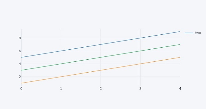 # set for loop for figure data for trace in fig['data']: # Hide legend column names not equal to 'two' if(trace['name'] != 'two'): trace['showlegend'] = False