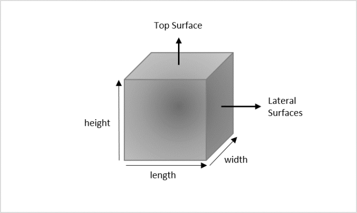 To calculate the area of a cube, let us first revise the concept of a cube. A cube is a geometrical figure containing three dimensions: length, width, and height with all the dimensions having equal measurements. It has six square faces, four of which are lateral surfaces and the other two are the cube's top and bottom surfaces.