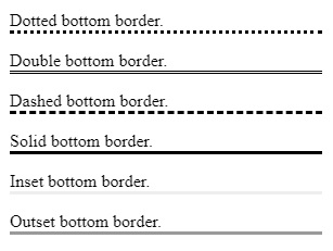 To set the style of the bottom border, use the border-bottom-style property. The values for the border you can set is, dotted, double, dashed, solid, etc.