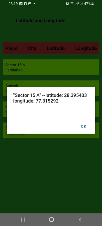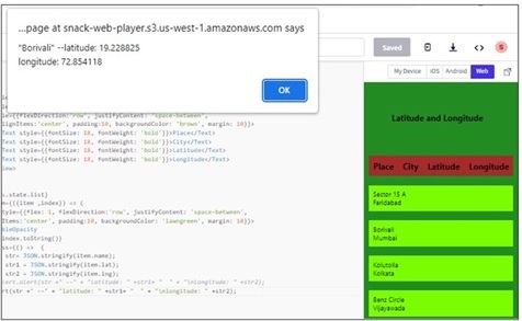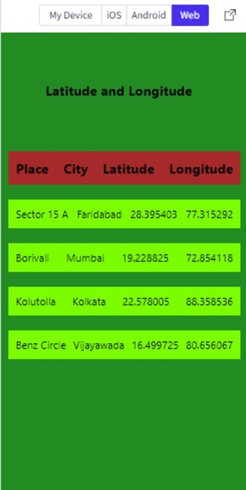 Step 6 ? The function onPress() specifies the action to be taken when a list item is clicked. For example, here the latitude and longitude values as result are displayed in the alert after converting the JSON object as text.
