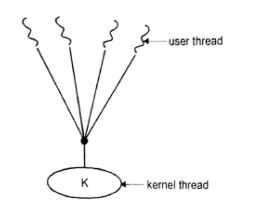 It maps many user threads to one kernel thread. The thread management is based on the thread library in user space, because of this it is efficient but the entire process is going to block if a thread makes a blocking system call.