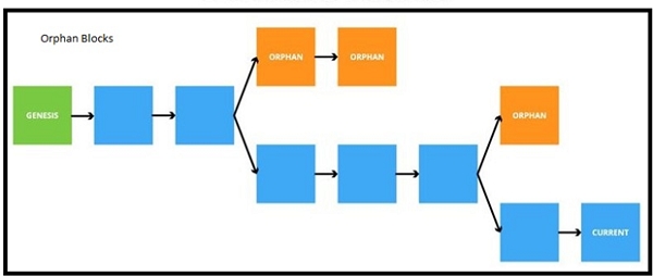 Here comes the twist. There will be some blocks which are created, but not accepted by the block chain network. There are called Orphan Blocks. Orphan blocks are verified and valid blocks, but not accepted by the block chain network due to a time lag in the acceptance of the block. Orphan Blocks are the rejected blocks which are very much valid. They will remain as detached blocks in the cryptocurrency network.