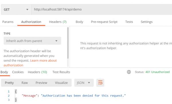 Since we have added the authorize attribute over the action method, proper authorization like bearer token, API key, OAuth etc., should be used to access the action method. Unauthorized access will result in 401 Unauthorized response which is shown below.