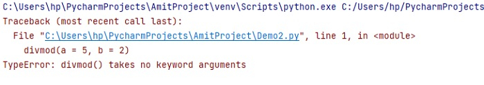 In the above example, an error occurred since the divmod() takes no keyword arguments.