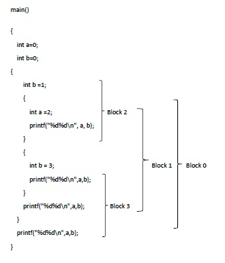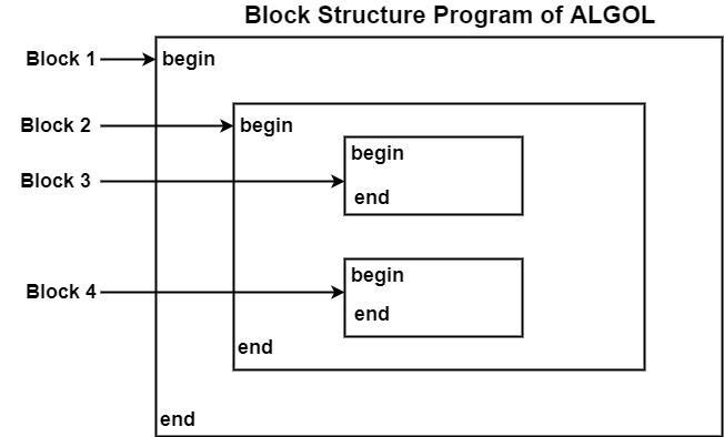 where the braces limit the block. The characteristic of a block is its nesting structure. Delimiters mark the starting and end of the block. In 'C' language, the braces { } act as delimiters, while ALGOL uses begin and end. Delimiter ensures that the block is independent of one another or is nested inside the other. The nesting property is sometimes referred to as a block structure.