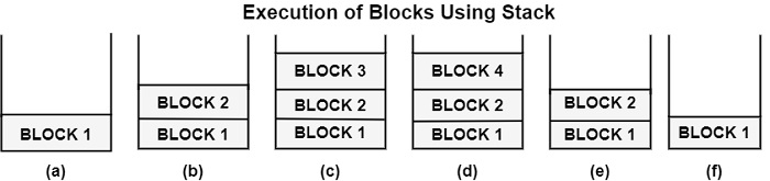 The execution of the above block structure program using stack can be shown in the following way −
