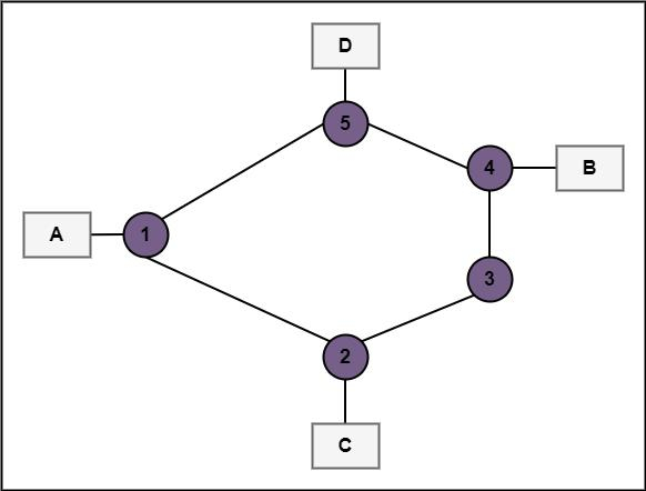 If a message is transmitted from station A to station B, it can take either path 1-2-3-4 or 1-5-4 depending on the free output path's availability at that particular moment.