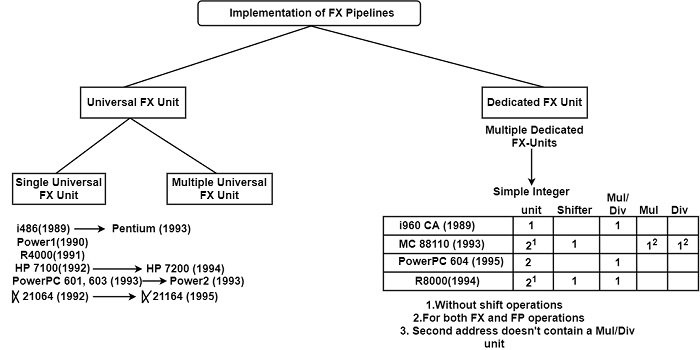 There are two possible approaches to multiply the number of FX pipelines as the first approach is to use multiple universal pipelines and thus multiple universal FX units for all supported integer and Boolean instructions. The other possibility is to employ multiple dedicated pipelines for different classes of integers and Boolean instructions, implemented as multiple dedicated FX units.